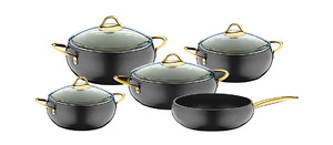 Набор посуды OMS 3040 из литого алюминия с толстым энергосберегающим дном. Внешняя и внутренняя поверхности из безопасного для здоровья 4-х слойного высокачественного ПТФЭ антипригарного гранитно-мраморного покрытия.