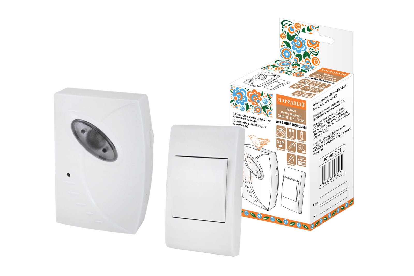 Звонок беспроводной на батарейках народный ЗББ-Н-11/4-32М (32 мелодии, кнопка IP30, 2х1,5В АА)